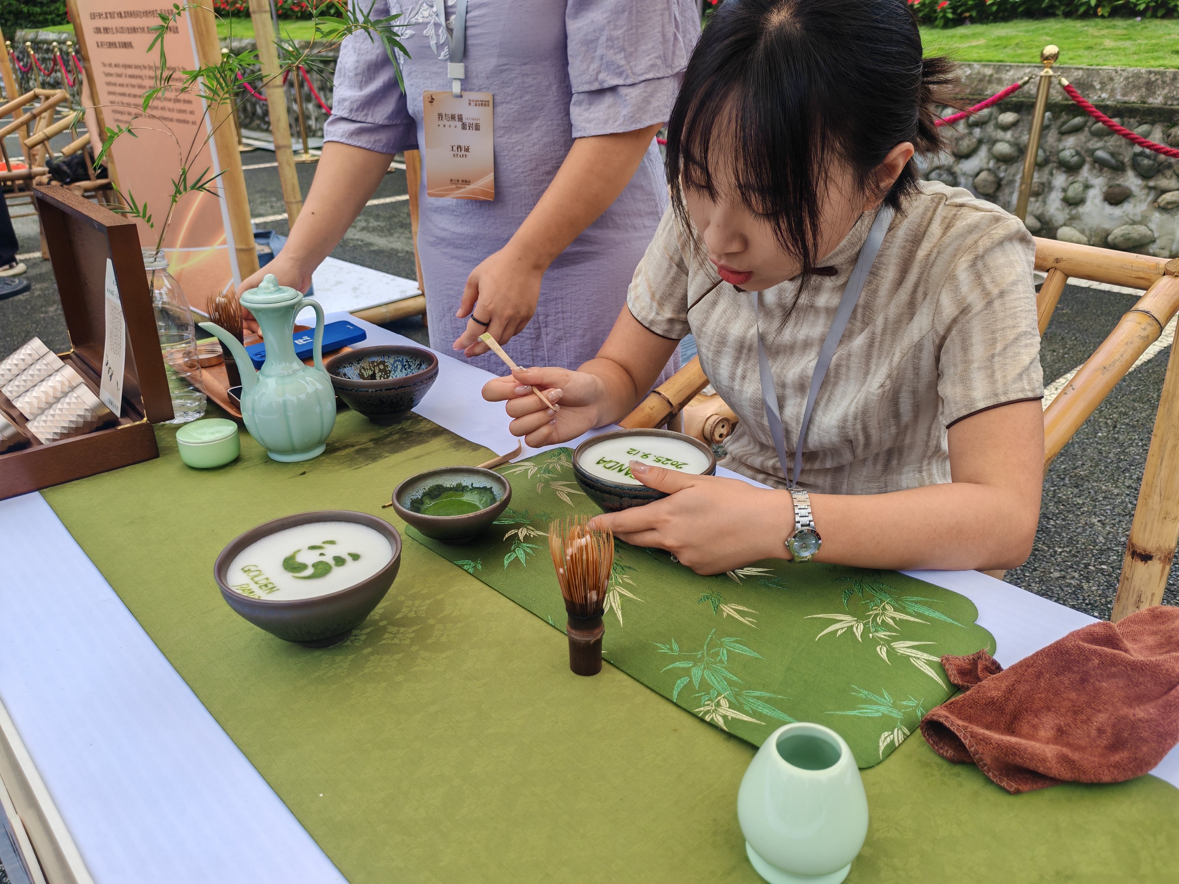 在“熊猫奇摊”体验区,嘉宾们切身参与了蜀谈茶艺、木雕印刷等四川非物资文化遗产体验举止。